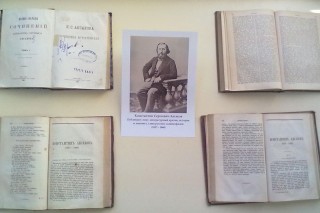 На выставке представлены произведения К.С. Аксакова: Т.1 из Полного собрания сочинений, изданного в 1889 г., литература о жизни и творчестве писателя, воспоминания.